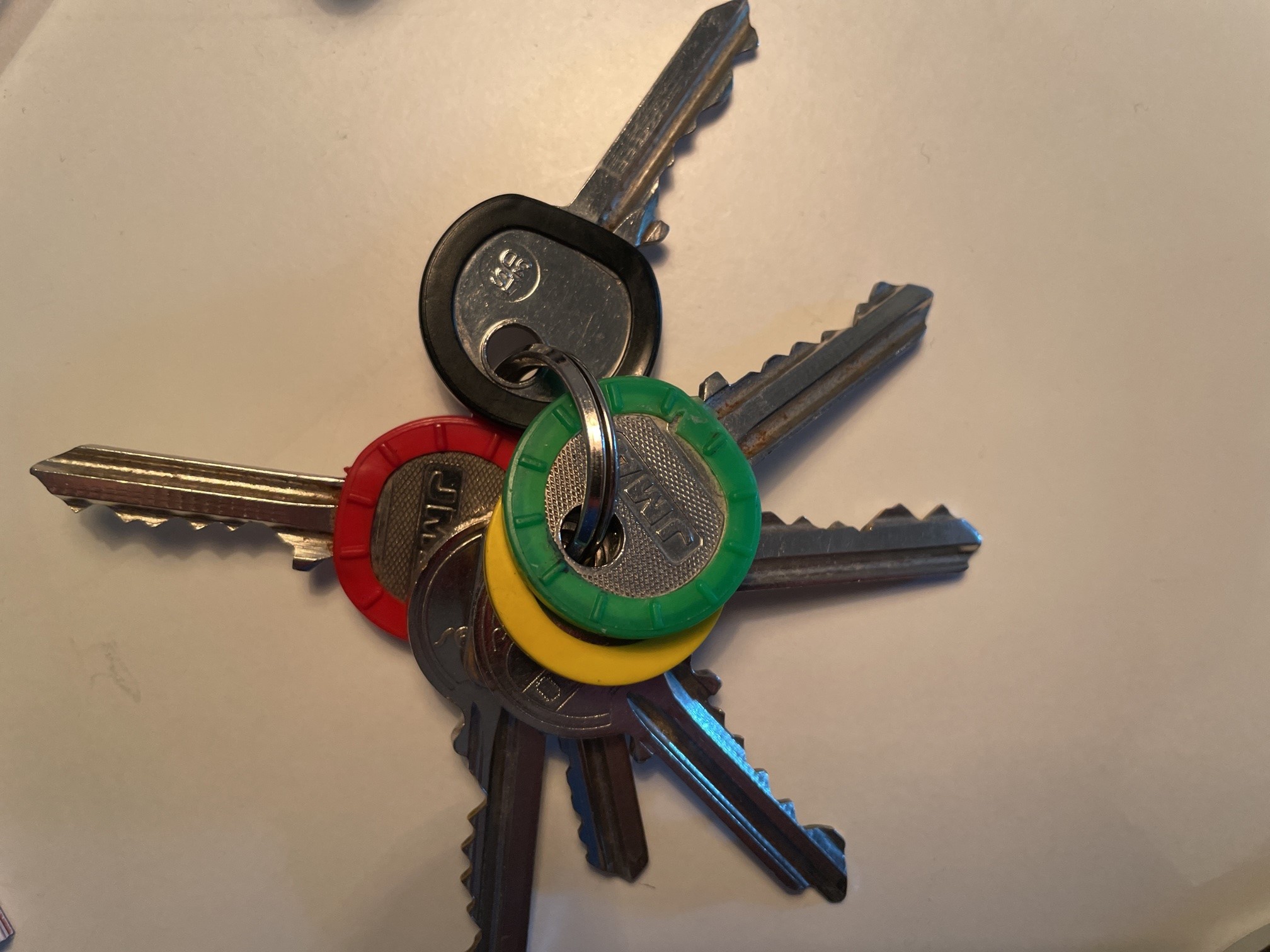 Svart nyckel - grind till gatan Grön nyckel - dörr till altan baksida En av de utan färg - garage/poolrum (högra dörren)