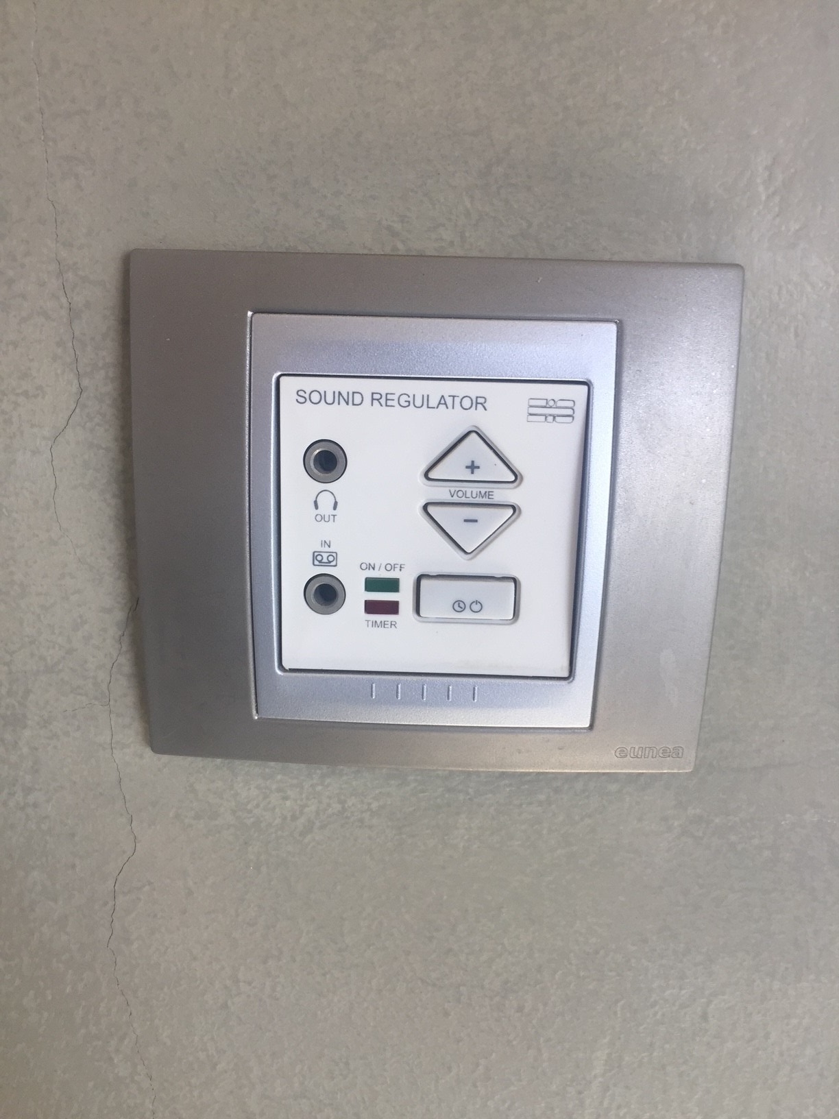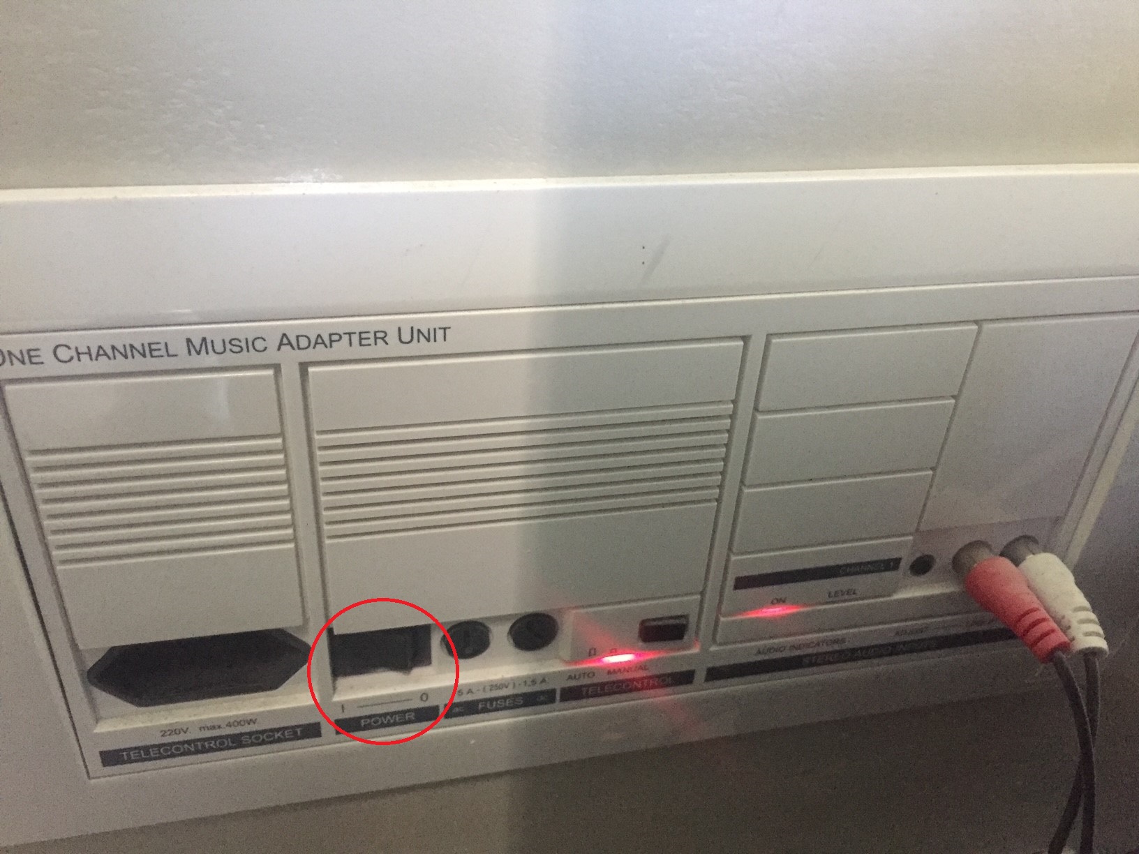 Stäng av musikanläggningen genom att slå av anläggningen. Panelen sitter under lilla bordet vid köket.