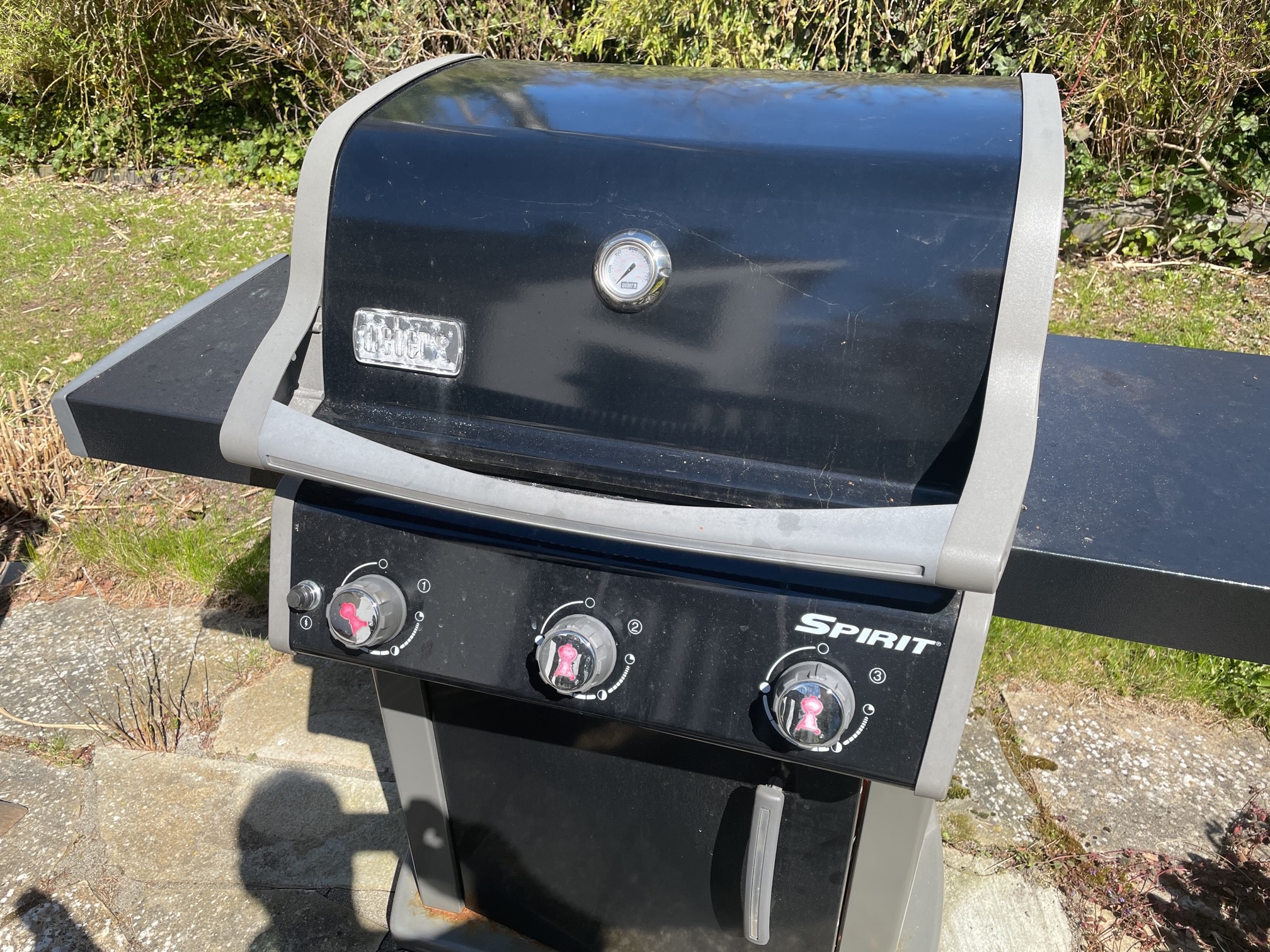 För att grilla sätter du på gasen på gasflaskan. Vrid så att den visar rött (då är den på). Vrid sedan det vänstra vredet på grillen till den fyllda cirkeln. Tryck in knappen till vänster om vredet till, upprepa tills den tänds. Kom ihåg att stänga av gasflaskan efter grillningen (visar grönt!).