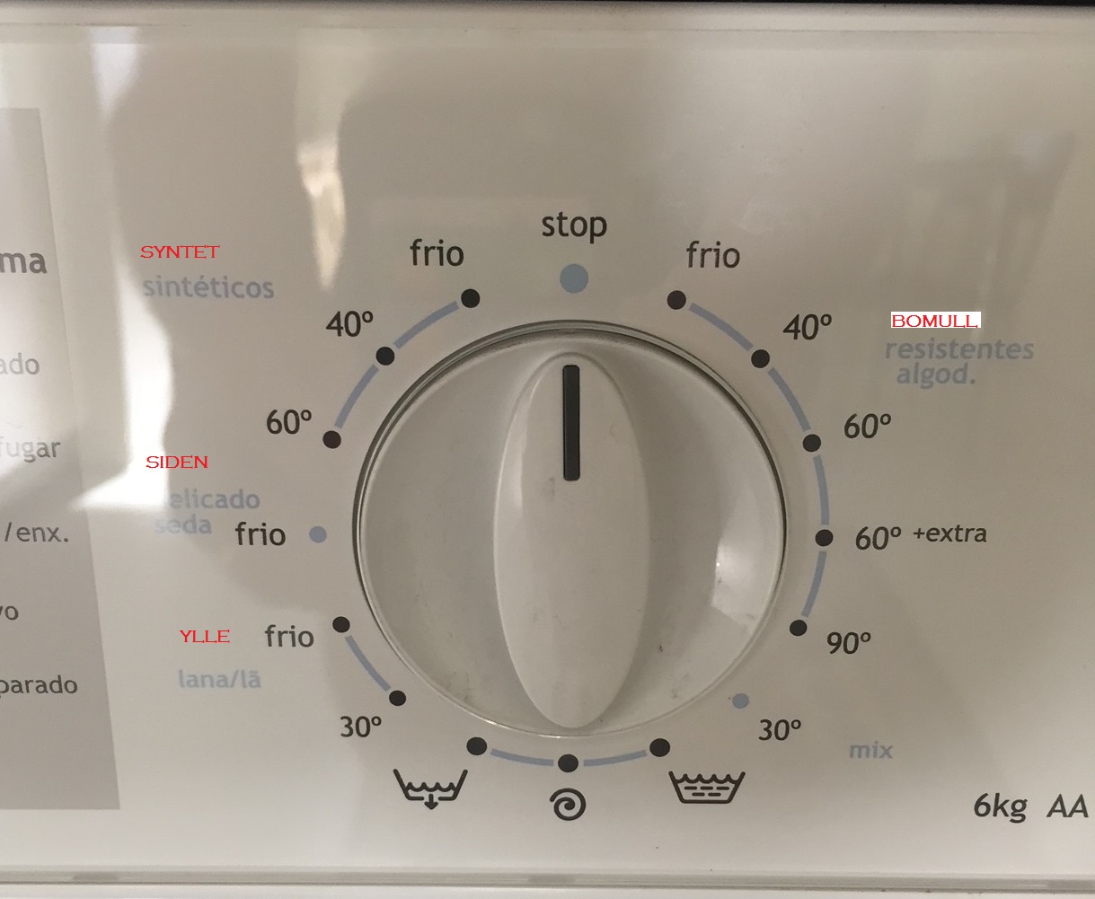 Välj program och temperatur enligt bilden. Tvättmedel finns i skåpet under diskhon. Torkställningen står i förrådet bakom köket.
