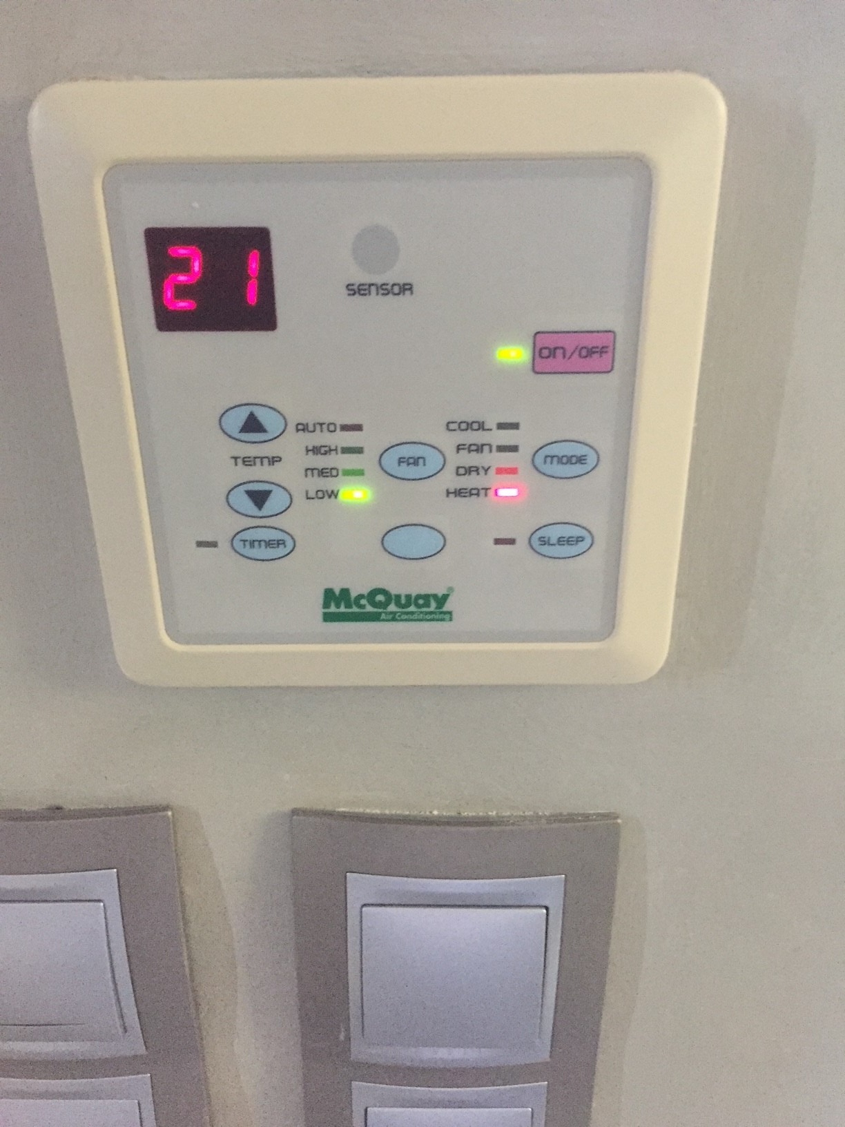 Ifall poolen ska vara uppvärmd använd appen Pool Comfort eller använd panelen på väggen i poolrummet. Tryck på Mode tills den solsymbolen lyser. Ställ in önskad värme med +/-. För att använda uppvärmningen måste poolpumpen gå hela tiden.