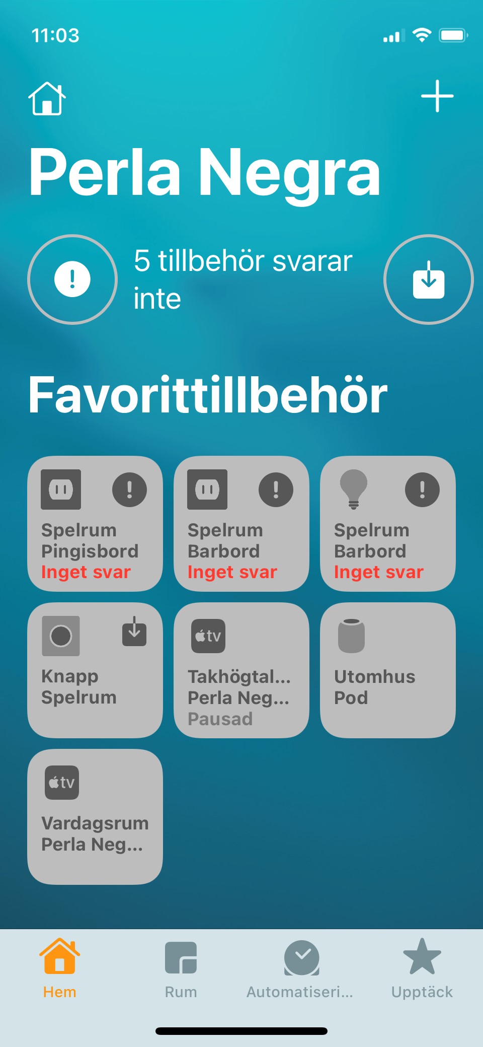 För att tända lamporna i taket i spelrummet använder du appen Hem. Välj Perla Negra (om det behövs).