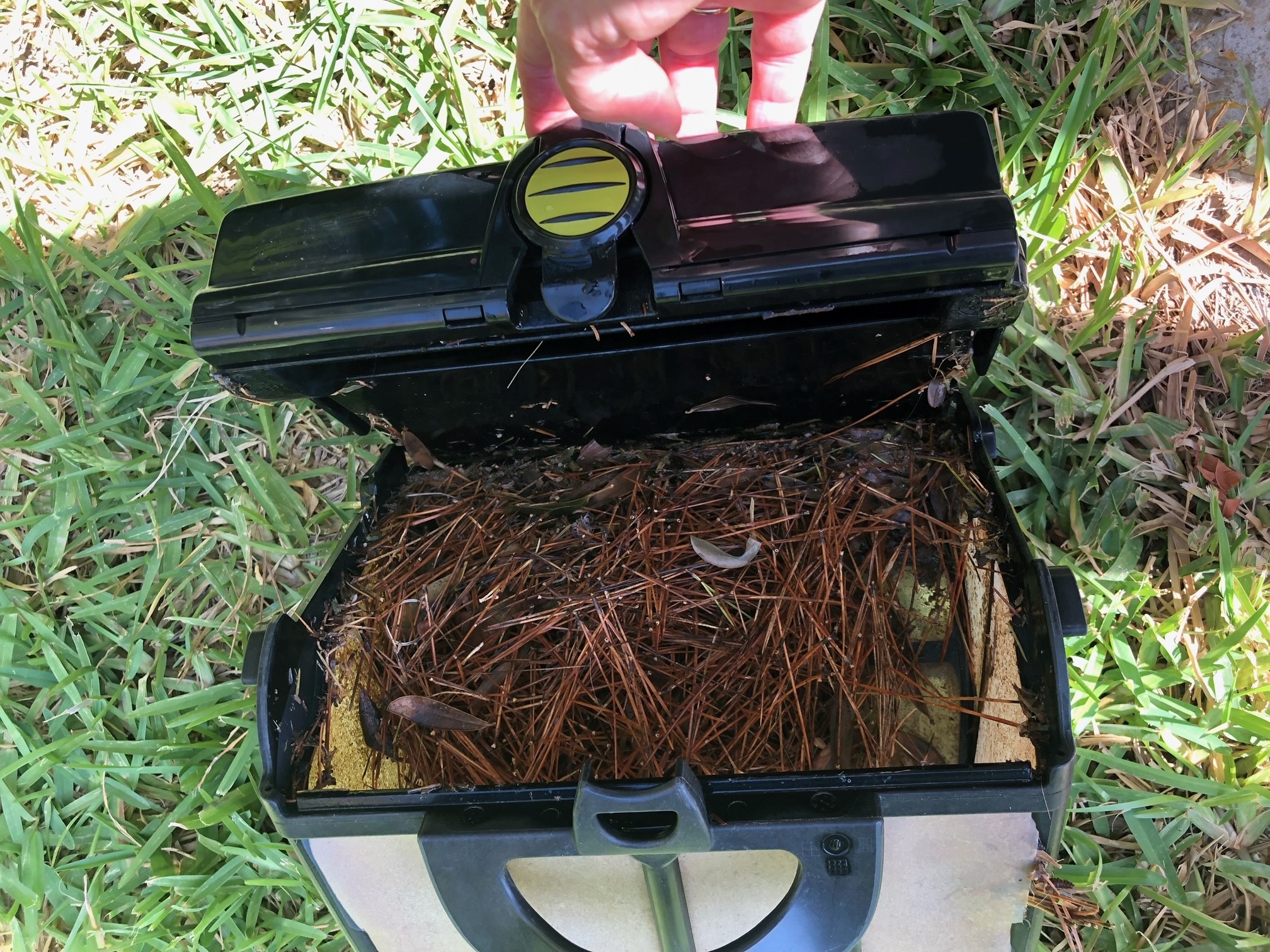 ... trycker du på den gula knappen och vrider upp locket. Töm filtret i soptunnan. Ifall locket lossnar så fäster du det längst ner genom att häkta fast det innan det stängs.