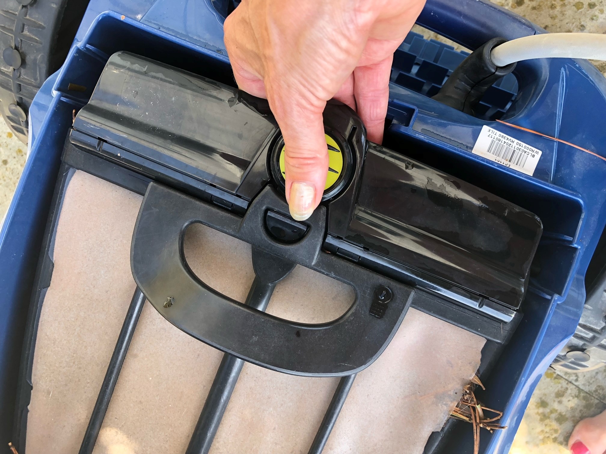För att tömma filtret på Roberto, öppna locket med gula knappen. Ta sedan och lyft upp filtret enligt bilden. För att tömma filtret ...